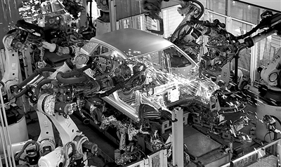2月7日,机器人在上汽集团乘用车福建宁德基地车身车间生产线上作业。新华社发(王旺旺 摄)