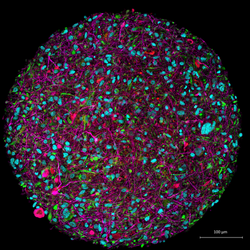 实验室培养的大脑类器官的放大图像,具有针对不同细胞类型的荧光标记。(粉红色—神经元;红色—少突胶质细胞;绿色—星形胶质细胞;蓝色—所有细胞核)。
