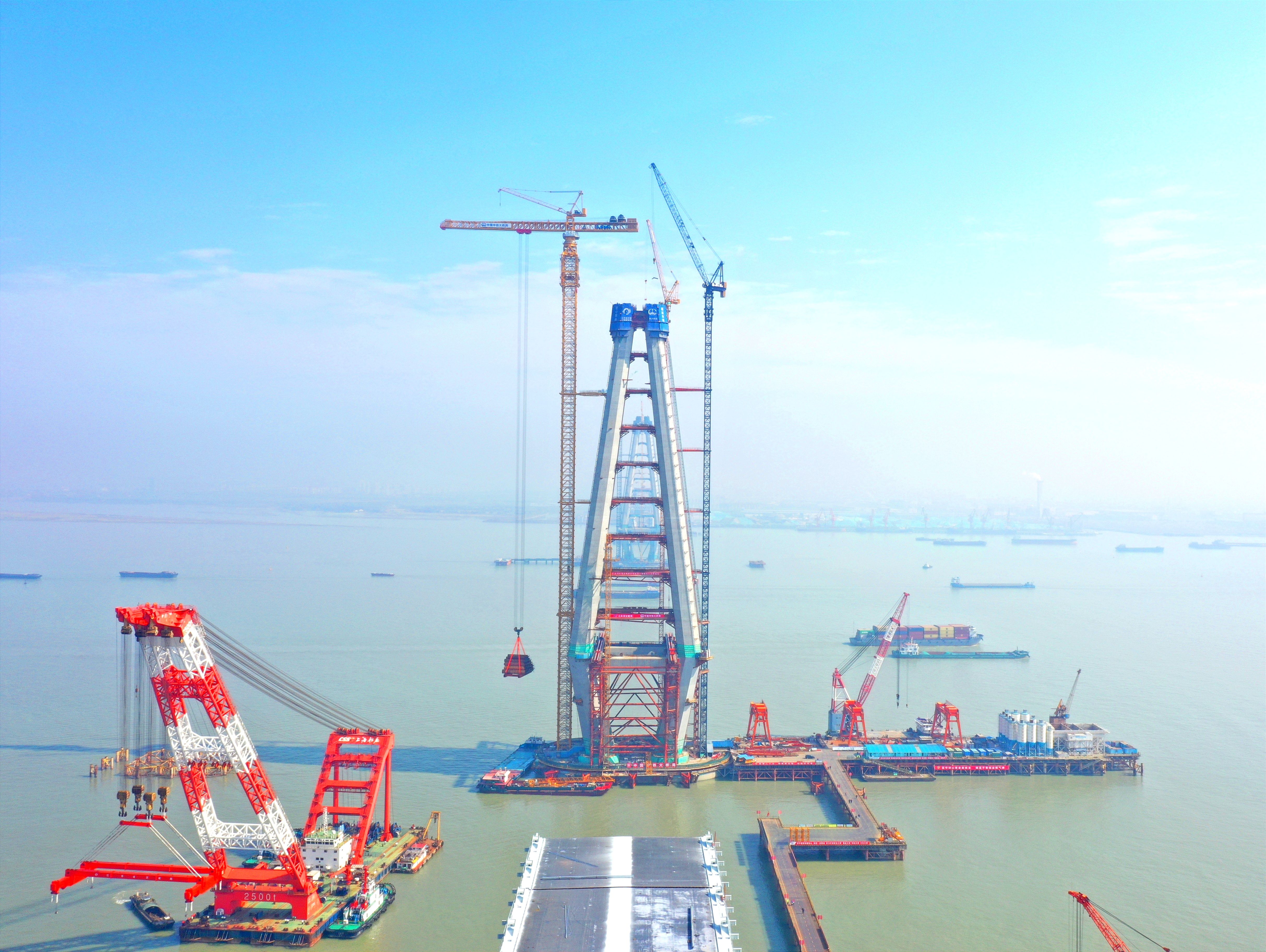 全球最大塔机XGT15000-600S投入常泰长江大桥6号主塔施工。孙璐 摄