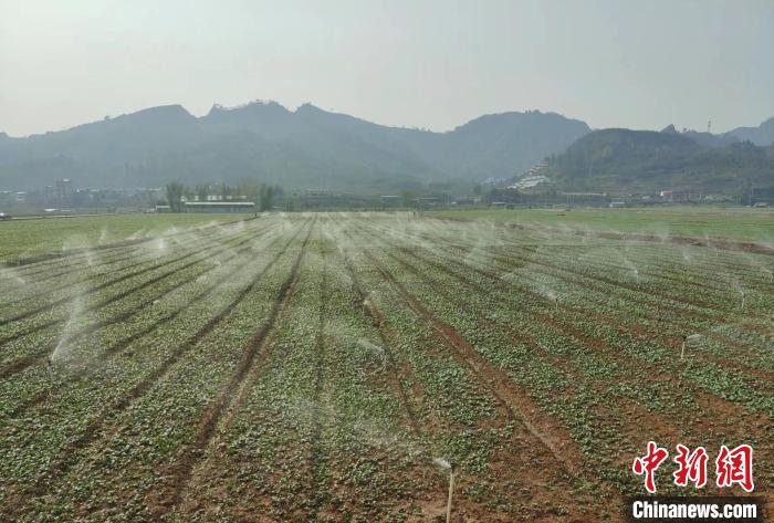 蔬菜基地喷淋系统在作业。 韦莲香 摄
