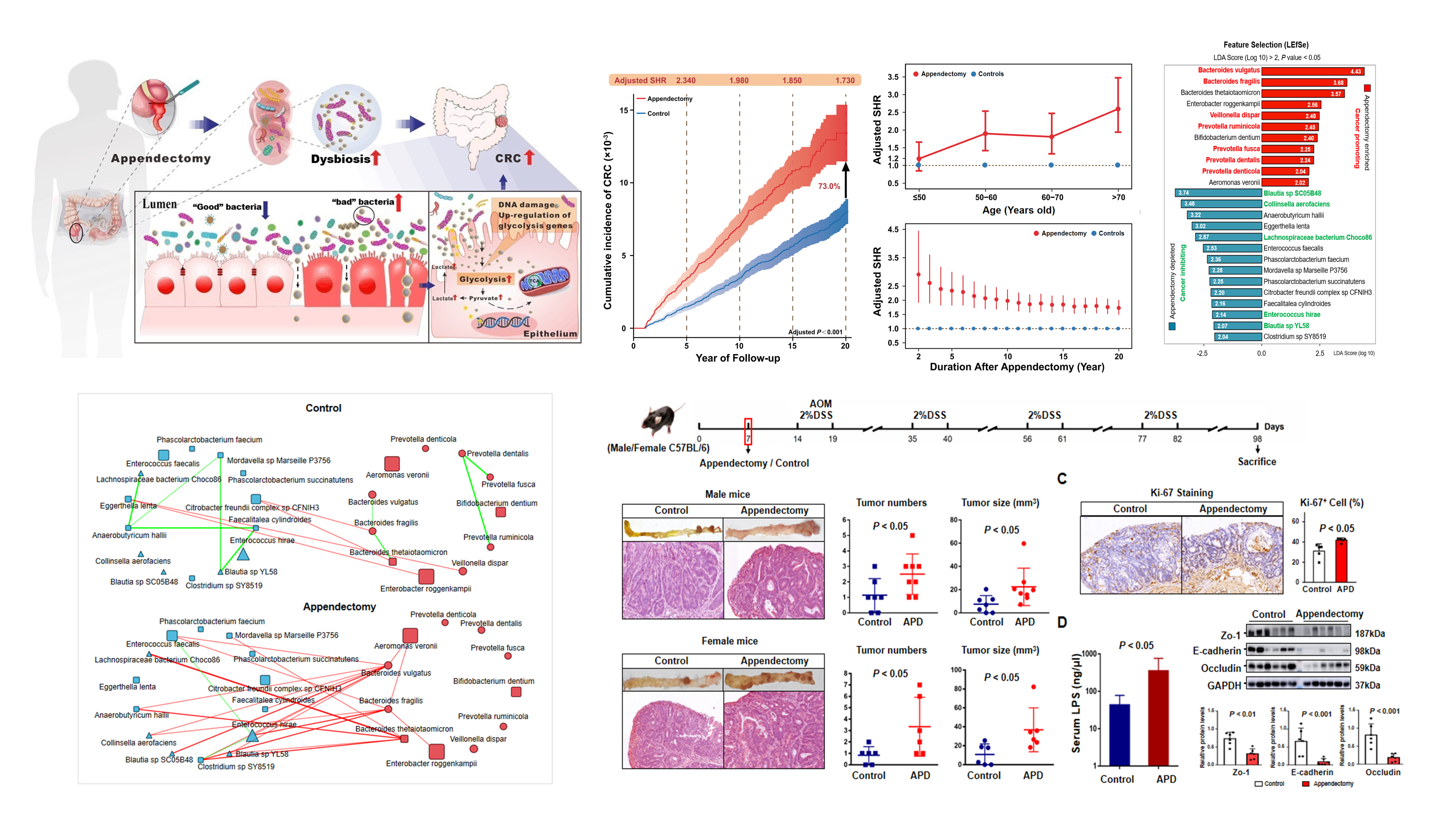 西安交大科研团队通过坚持分析来自西安与香港的40万人群大型队列,并对既往患者最长20年随访后发现,相比对照组,阑尾切除组人群CRC发生风险增加73%。进一步通过招募157名阑尾切除术患者和157例正常对照,进行粪便菌群宏基因组测序后发现,阑尾切除术组人群的肠道菌群显著失调,普通拟杆菌 脆弱拟杆菌等7种促进CRC的细菌富集,厌氧菌海氏肠球菌等5种有益共生菌减少,整体肠道菌群的相互作用关系有向促炎促癌转变的趋势。同时在动物体内模型中发现,切除小鼠阑尾损伤肠屏障功能后,在菌群的影响下通过偶氮甲烷(AOM)/ 葡聚糖硫酸钠(DSS) 模型可加速诱导CRC发生发展,但采用广谱抗生素清除菌群后无明显差异。科学家们建议,临床医生诊疗中应更加审慎、全面地考虑施行阑尾切除术的必要性,还必须对阑尾切除患者(尤其是高龄患者)术后长期肠镜随访。
