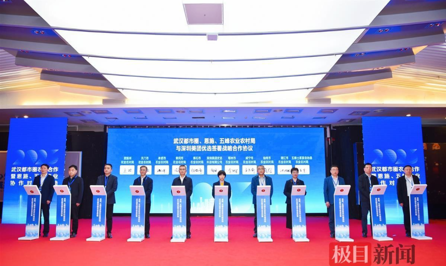 活动现场,美团优选和都市圈各城市及恩施、五峰签订了农产品销售框架合作协议。武汉流通企业与相关城市生产企业签订了农产品采购协议,包括湖北东方神农生态科技开发有限公司与孝昌县兴达专业合作社签署农产品采购协议;湖北菱湖尚品洪山菜苔农业发展有限公司与恩施十姊妹生态农业发展有限公司签署蔬菜采购协议;武汉市金水祺良农副产品有限公司与湖北省嘉野生态农业有限公司签署莲藕采购协议;湖北汇东农产品有限公司与武穴市梅川瞳创种植专业合作社签署水果采购协议;武汉汪集汤业食品有限公司与湖北晨科农牧集团签署老母鸡采购协议。