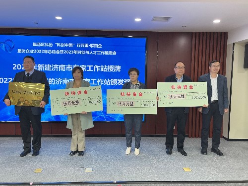 李武为2022年新建市级专家工作站(济南豪瑞生物技术有限公司专家工作站)授牌,并为2022年通过复审的2家济南市专家工作站(济南利江自动化设备有限公司、济南科润生物技术有限公司)颁发奖励。