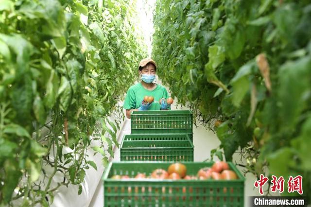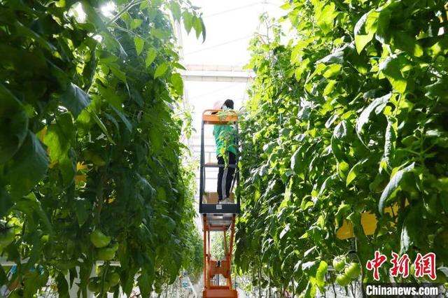 中新网银川3月13日电(记者 于晶)3月13日,走进宁夏银川市永宁县闽宁镇凯盛(银川)现代智慧农业产业园内,一排排红绿相间的西红柿挂满枝头,身着统一工装的工人们站在轨道车上穿梭其间,正在采摘成熟的番茄。