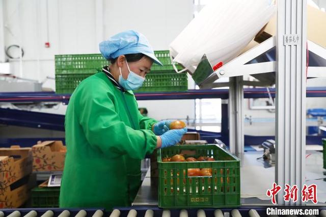 工人对即将销往全国各地的番茄装箱。 于晶 摄