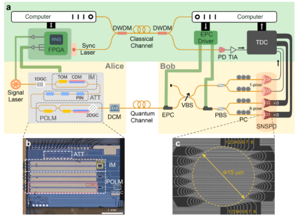 潘建伟、徐飞虎研究组发展了集成光子片上高速高保真度偏振态调制技术,系统重频达到2.5GHz,量子比特误码率优于0.35%;结合中科院上海微系统所最新研制的八像素SNSPD,实现了高计数率、高效率的单光子探测;同时,研究组发展了偏振反馈控制、高速后处理模块等。在上述技术突破的基础上,研究团队实现了10公里标准光纤信道下115.8 Mb/s的密钥率,较之前纪录提高了约一个数量级;系统稳定运行超过50个小时,在传输距离328公里下码率超过200b/s。上述研究成果表明,量子密钥分发可实现百兆比特率的实时密钥分发,满足高带宽通信需求,对未来量子通信的大规模实际应用具有重要意义。