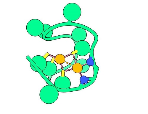 Nickelback肽的计算机渲染图显示了键合两个关键镍原子(橙色)的主链氮原子(蓝色)。
