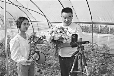 3月14日,在山东省菏泽市牡丹区黄堽镇,两名销售芍药鲜切花的电商主播在芍药种植大棚内进行网络直播销售。目前,菏泽芍药鲜切花种植面积超过3万余亩,今年预计销售量超过8000万枝。新华社记者 徐速绘 摄