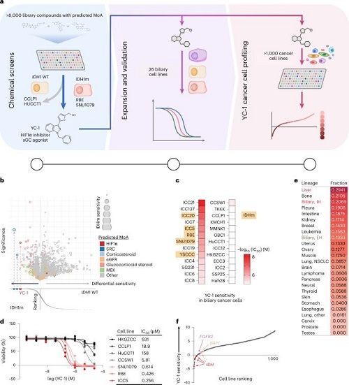 最新研究由马萨诸塞州总医院癌症专家纳比尔·巴迪西领导的团队和美国国立卫生研究院马修·霍尔领导的团队携手开展。胆管癌的特征是IDH1酶会发生突变。巴迪西团队希望找到能有效应对IDH1突变的化合物和药物。霍尔等人则以IDH1为靶标,快速测试了数千种获批药物和实验性癌症药物对胆管癌细胞的杀伤效果。结果他们发现了一些可杀死癌细胞的分子,其中包括一种名为YC-1的分子,但后续研究表明,YC-1并不影响IDH1的突变。
