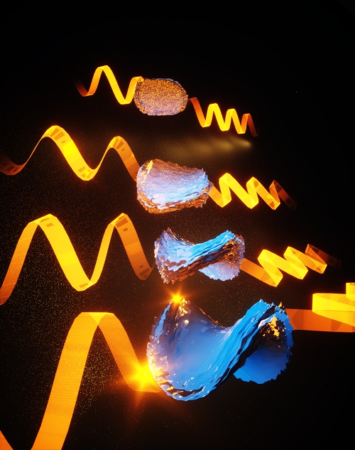 扭曲的亮橘色“蝴蝶结领结”。该图显示了光波接近扭曲的金属领结,并被领结的形状所转动。