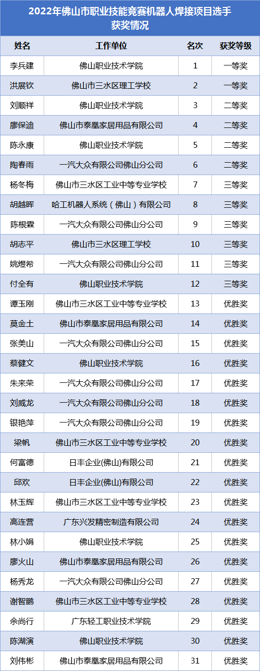 经过激烈角逐,大赛最终产生一、二、三等奖和优胜奖获奖选手,成绩前8名选手由佛山市人力资源和社会保障局颁发“佛山市技术能手”称号,优胜奖以上的获奖选手将获得焊工高级工职业技能等级证书。