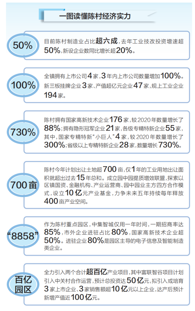 从出台扶持政策到加快园区建设,再到提升用地效率,陈村引导各类优质资源要素向制造业聚集的新一轮排兵布阵,彰显着陈村勇于突破的思维方式。