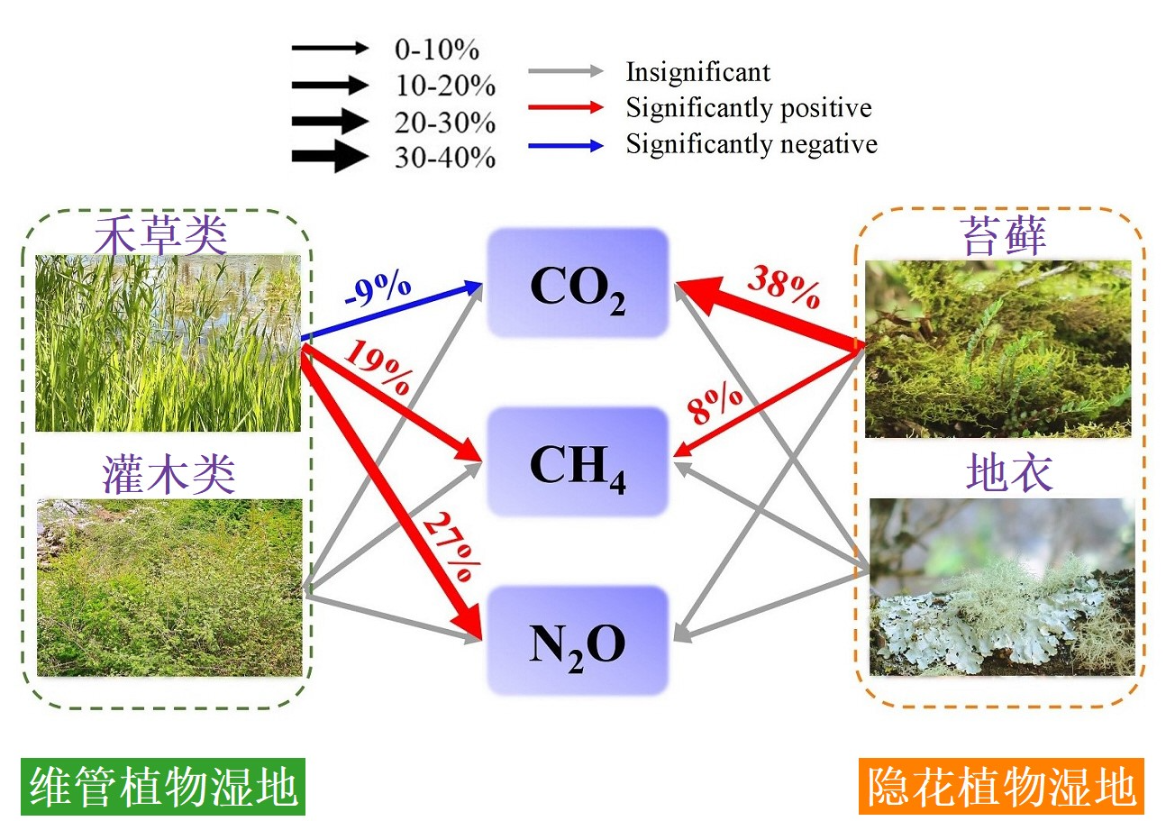 增温后,灌木类、禾草类等维管植物占优势的湿地,二氧化碳净吸收增加;苔藓、地衣等隐花植物占优势的湿地,二氧化碳净排放显著增加。但不管湿地优势植物功能群如何,增温都促进了湿地甲烷的净排放。