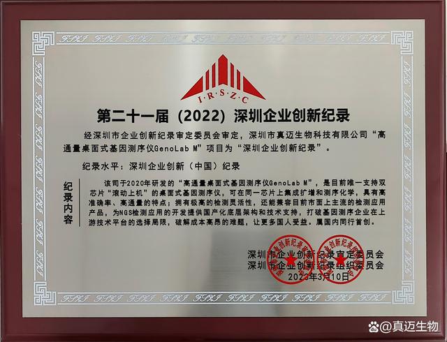 近日,第三届深圳企业创新促进大会暨深圳工业总会2022年度年会圆满召开,会上重磅发布“2022粤港澳大湾区企业创新力榜单”。真迈生物再度荣登“未来创造之星榜”,真迈生物自主研发的GenoLab M高通量基因测序仪获颁第二十一届(2022)企业创新记录。