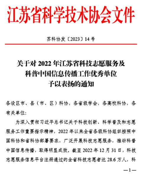2023年新春伊始,我院科协因在科技志愿服务信息平台、“科普中国”App 注册认证及科普员队伍建设等工作中的出色成绩,荣获2022年度江苏省“科普中国信息传播工作优秀单位”荣誉称号。