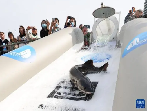 3月26日,湖北省宜昌市的胭脂园里人头攒动,一条长约1.5米的中华鲟从高台处乘坐“滑梯”顺流而下款款入江,激起一片水花后,畅游远去。约有6万尾大小不一的中华鲟涌入长江的怀抱。此前一天,已有10万尾中华鲟在湖北宜昌成功放流。