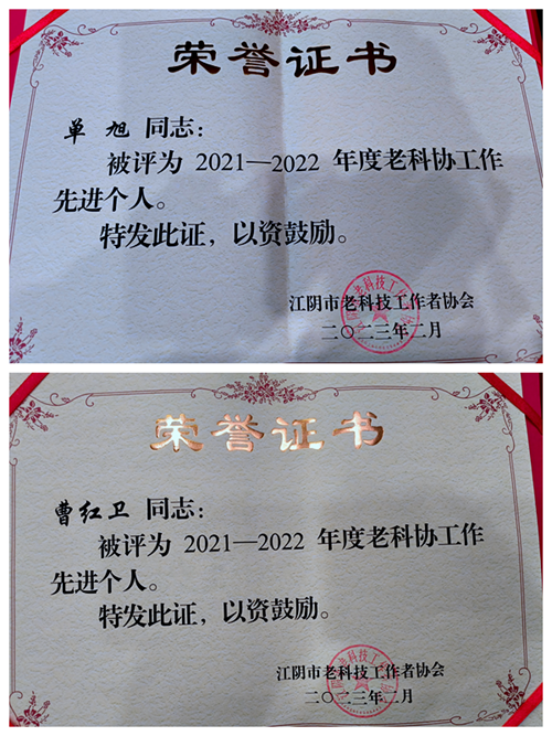 近日,江阴市老科协召开理事会扩大会议,会上对2022年度各类先进进行了表彰。我院老科协因在2022年度科协工作中表现突出,被评为“江阴市老科协先进集体”,副会长单旭和秘书长曹红卫被评为“江阴市老科协工作先进个人”。
