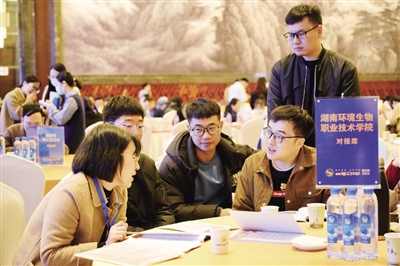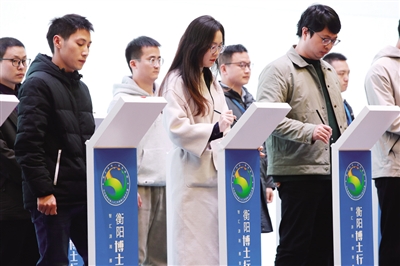 3月23日,在衡阳市丽波国际酒店宴会厅内,来自海内外知名高校的329名博士人才慕名来择“良木”,全市4所高校及3家附属单位、11家事业单位和38家企业携589个高端人才岗位需求,诚意满满欲求“千里马”。洽谈桌前,博士们仔细浏览用人单位简介和岗位需求信息,用人单位的工作人员热情讲解本单位及岗位需求信息和博士们关心的其他情况。双方友好交谈后,不少博士当场与用人单位达成初步就业意向。