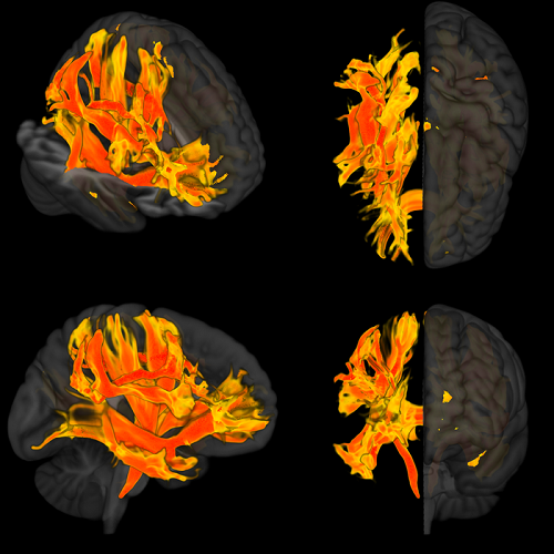 3D重建显示高收缩压如何影响大脑中的主要白质束。红色显示受高血压影响最严重的区域,而黄色区域也受到影响,但程度较轻。