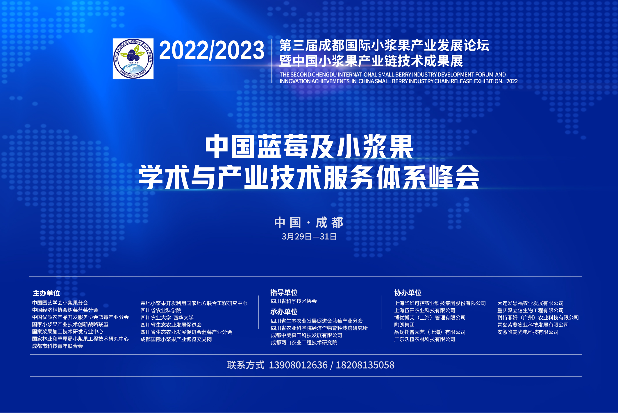 2023年3月28日,由四川省农业科学院、四川农业大学、西华大学、四川省生态农业发展促进会、四川省生态农业发展促进会蓝莓产业分会、国家小浆果产业技术创新战略联盟、国家浆果加工技术研发专业中心、国家林业和草原局小浆果工程技术研究中心、寒地小浆果开发利用国家地方联合工程研究中心、成都市科技青年联合会、成都国际小浆果博览交易网联合主办的“2023年第三届成都国际小浆果产业发展论坛暨中国小浆果产业链技术成果展”在蓉隆重举行。