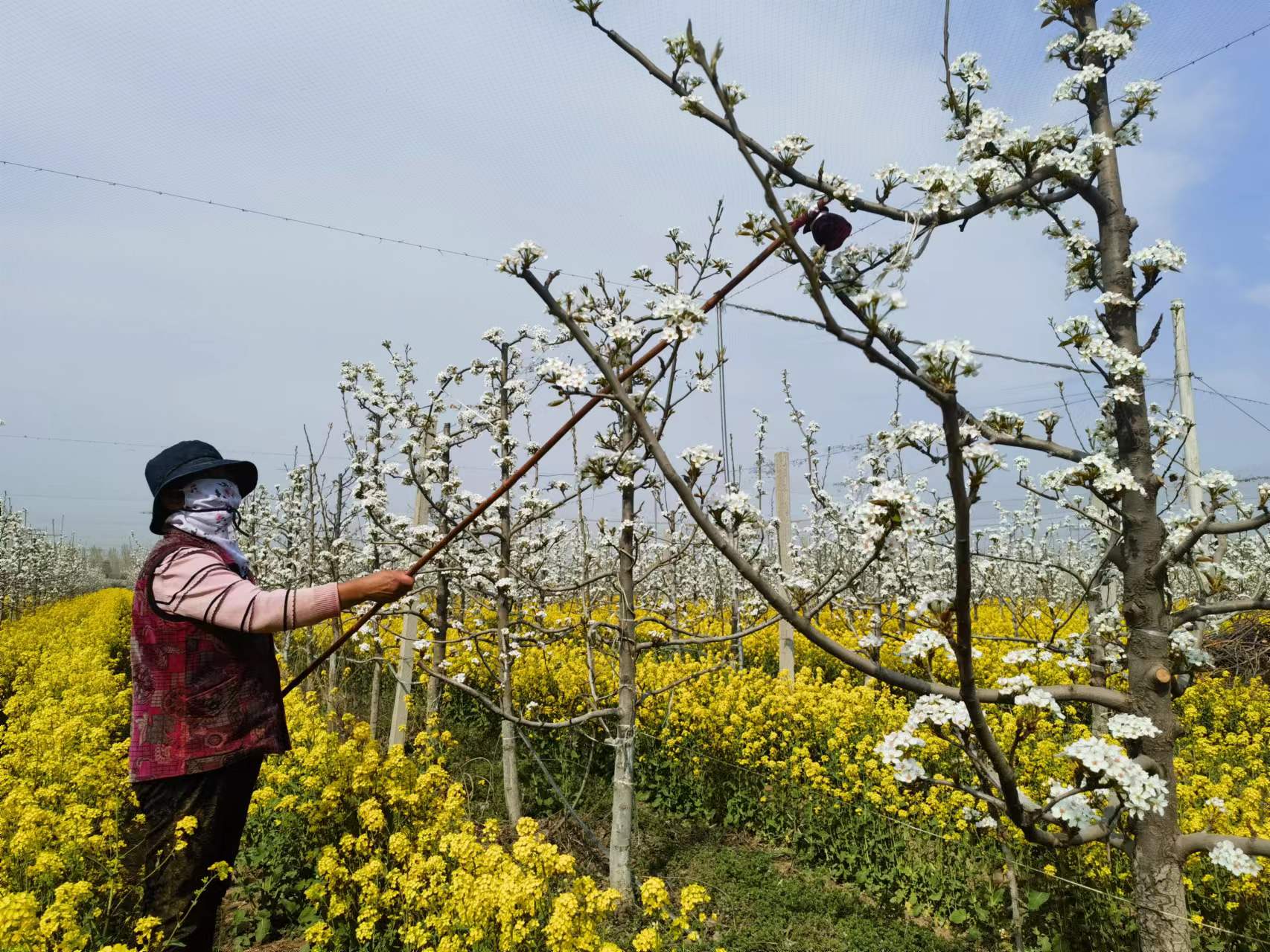 梨农正在对密植梨树进行异花授粉 陈汝健 摄