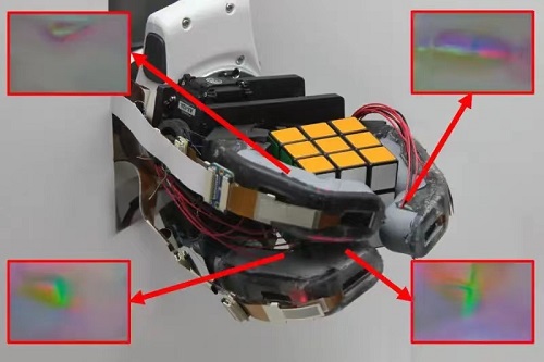此次制造的机器人手指,其刚性骨架包裹在柔软的外层中,在其透明的“皮肤”下集成了多个高分辨率传感器。传感器使用摄像头和LED收集有关物体形状的视觉信息,沿手指的整个长度提供连续感应,每个手指同时捕获物体多个部分的丰富数据。