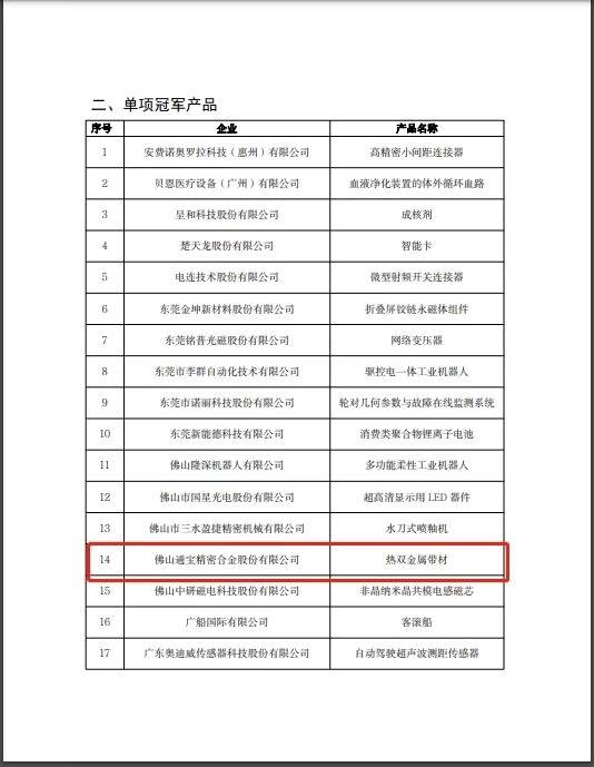 佛山通宝精密合金股份有限公司的产品“热双金属带材”上榜2022年省级制造业单项冠军企业(产品)名单。