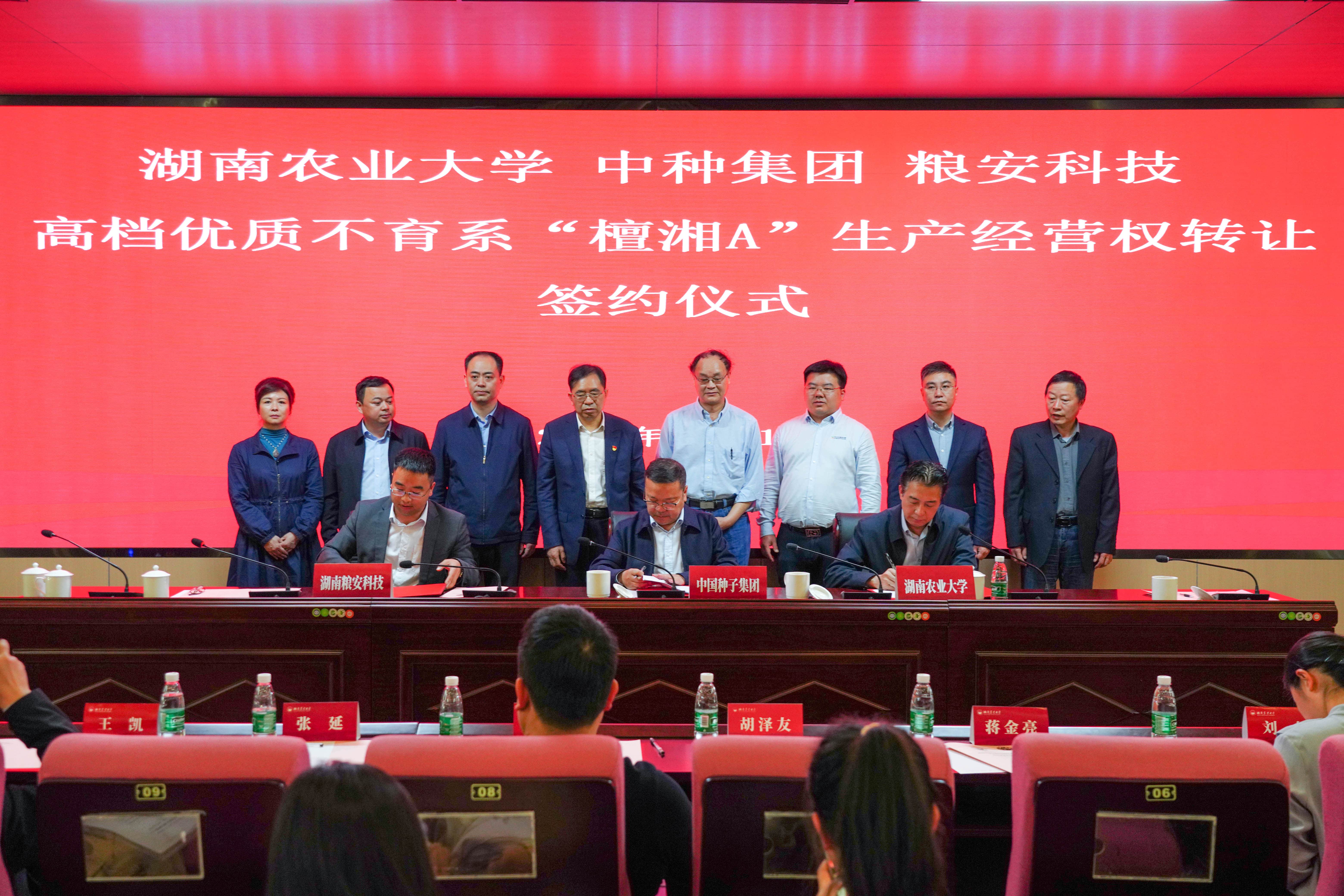 4月11日,记者从湖南农业大学获悉,该校与中国种子集团、湖南粮安科技股份有限公司,在长沙就高档优质水稻三系不育系“檀湘A”生产经营权转让签约。湖南农业大学和湖南粮安科技正式将“檀湘A”全球范围生产经营权转让给中国种子集团有限公司,转让费用500万元。