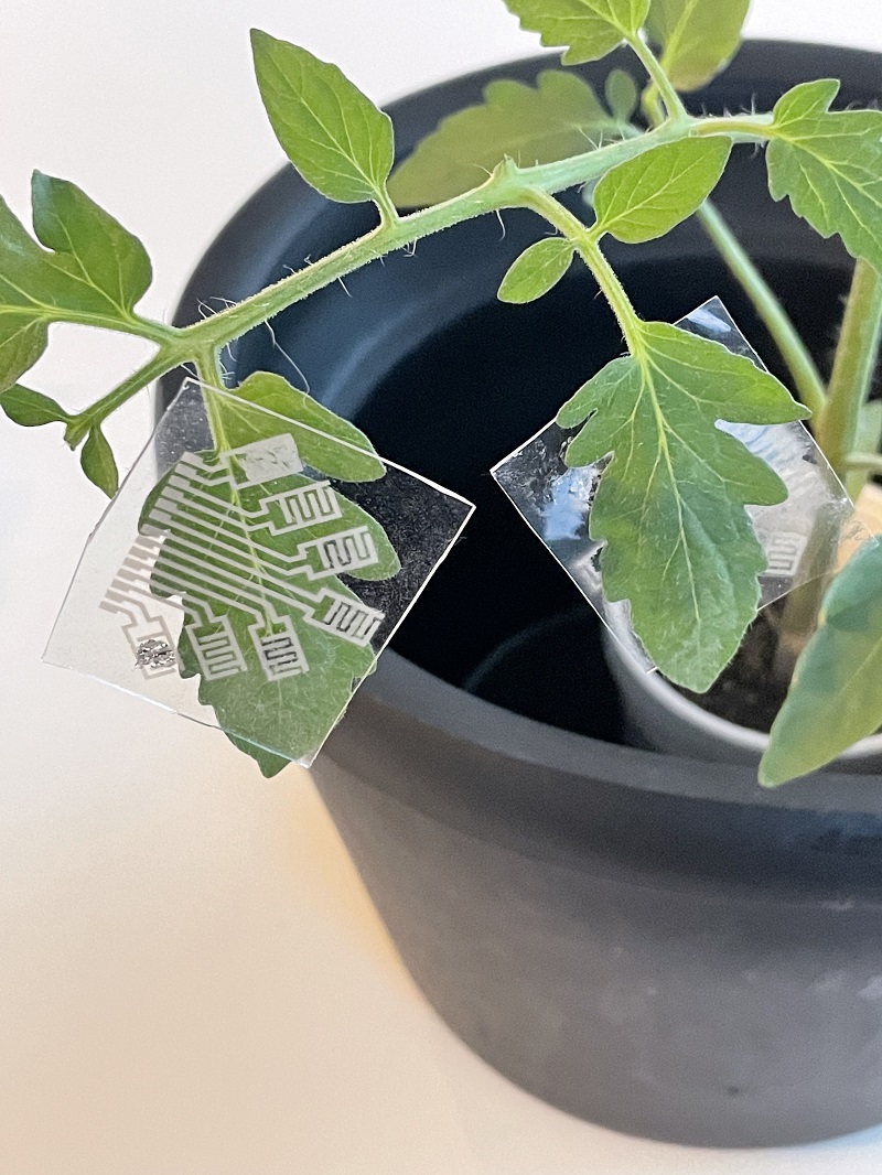 电子贴片可贴在植物叶片上,监测其是否有病原体,如病毒和真菌感染,以及是否受到干旱或盐分等因素影响。