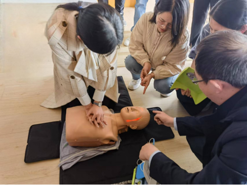 培训中还进行了心肺复苏急救的实操训练。边圆及医护人员借助人体模型演示了心肺复苏术与电除颤仪(AED)操作步骤、操作要领,并指导听课人员进行现场实践,确保高质量的胸外按压、开放气道、人工呼吸等心肺复苏操作规范准确。