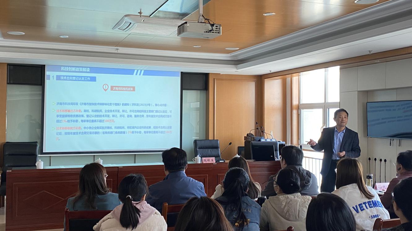 会议邀请济南市科技局成果转化及产业化处处长张根生同志,市科技局政策法规处二级调研员田兆江同志,市科技创新促进中心科长马永同志以及山东达创科技有限公室财务经理王晓同志分别宣讲了科技成果转移转化政策、技术合同认定登记流程和科技成果转化及享受政策补助有关知识。