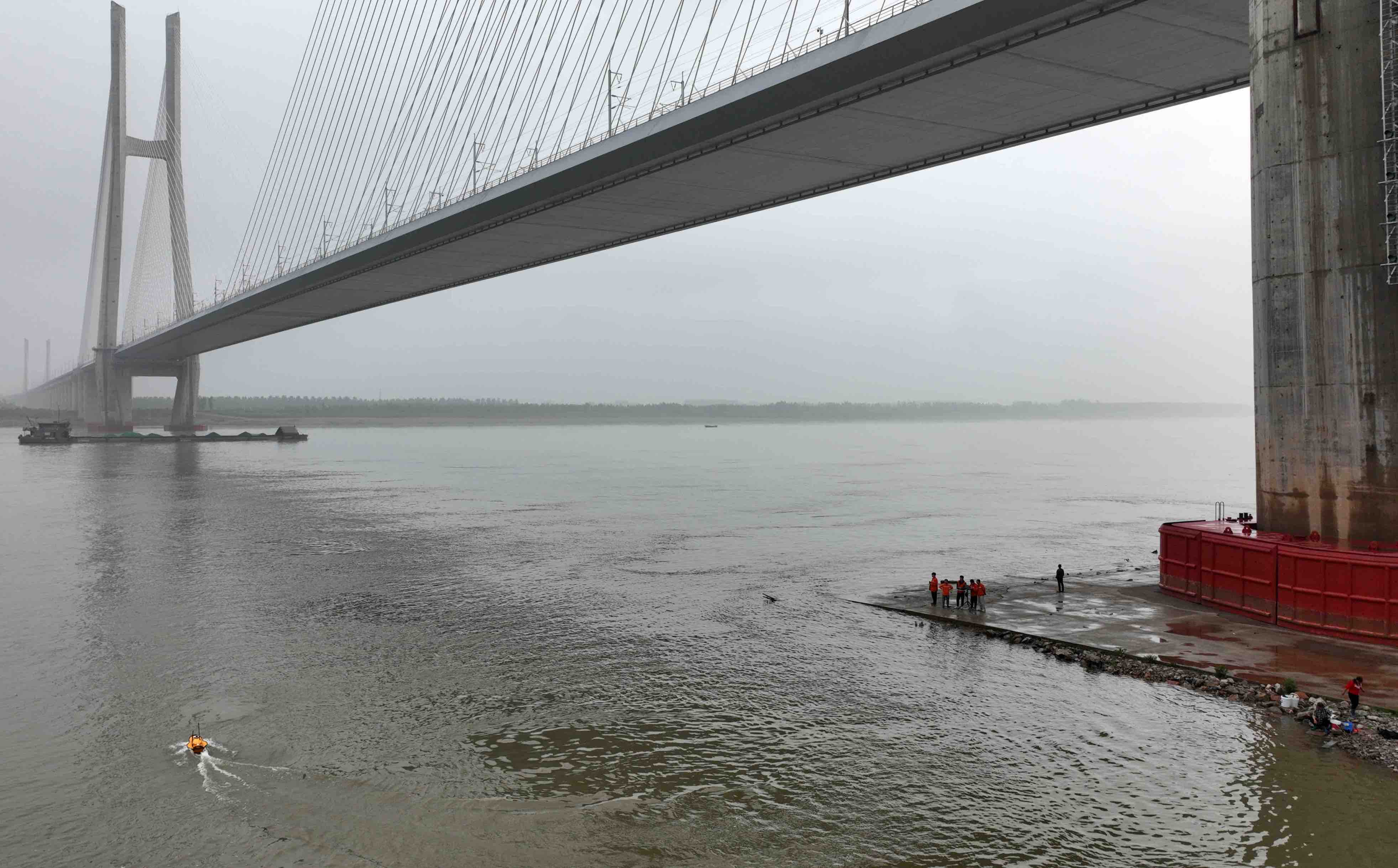 4月14日,在京港高铁安九段鳊鱼洲长江大桥桥下,南铁九江桥工段的工人们正在操作“无人船”进行水文测量和防撞设施检查。