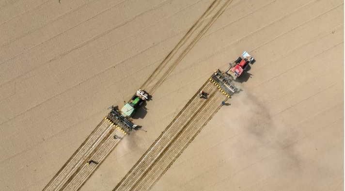 4月10日,在新疆维吾尔自治区巴音郭楞蒙古自治州博湖县博斯腾湖乡库代力克村,拖拉机在田野中播种棉花。