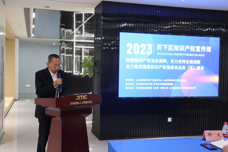 为深入实施创新驱动发展战略和国家知识产权战略,共同促进知识产权事业高质量发展,4月21日,济南市历下区2023年全国知识产权宣传周暨创建国家知识产权强县建设试点县(区)活动在济南(历下)国际人才创新中心路演大厅举行。山东省国家知识产权保护中心副主任尹强民、预审部主任佟兵,齐鲁知识产权交易中心主任靖纪飞参加活动。