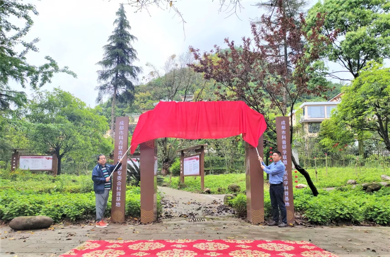 4月22日,成都市科技青年联合会青年医师专委会科普基地及成都市科普研学联盟“氢医学科普基地”,在中国道教发源地大邑县鹤鸣山落成。市科青联副秘书长马文杰与恩威集团总经办负责人林先生共同为基地揭牌。