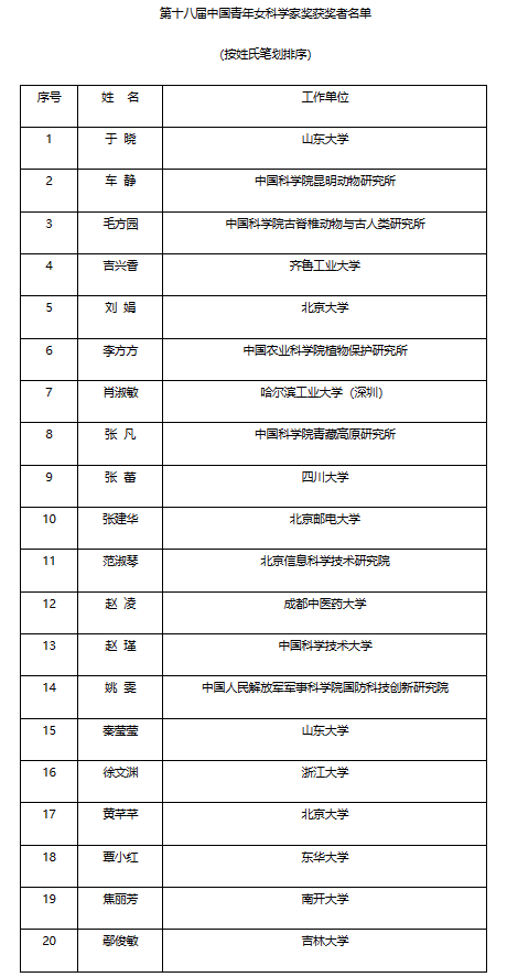 4月22日,第十八届中国青年女科学家奖颁奖典礼在京举办。全国政协副主席、全国妇联主席沈跃跃出席并为获奖者颁奖,全国妇联党组书记、副主席、书记处第一书记黄晓薇代表主办方讲话,中国科协副主席、第十八届中国青年女科学家奖评审委员会主任、中国工程院院士陈薇代表第十八届中国青年女科学家奖评审委员会作评选情况介绍。中国科协党组副书记、专职副主席、书记处书记束为主持。于晓等20人、大气复合污染协同防控技术研究团队等5个团队获奖,于彤等10人入选未来女科学家计划。