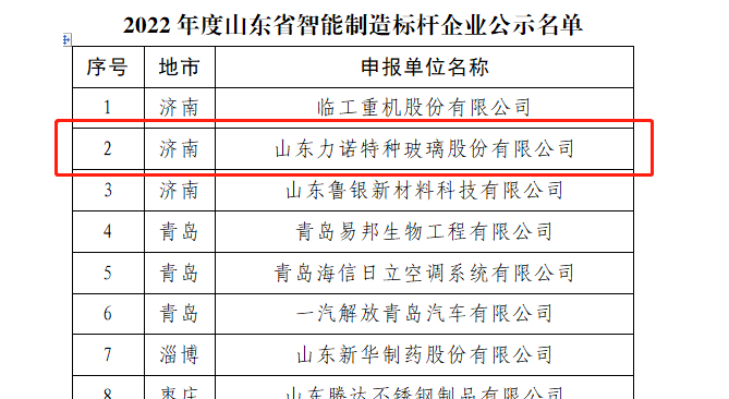 济南市商河县力诺特玻入选山东省智能制造标杆企业
