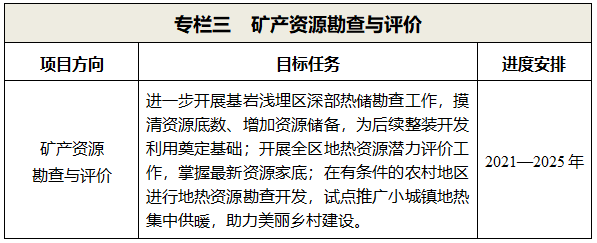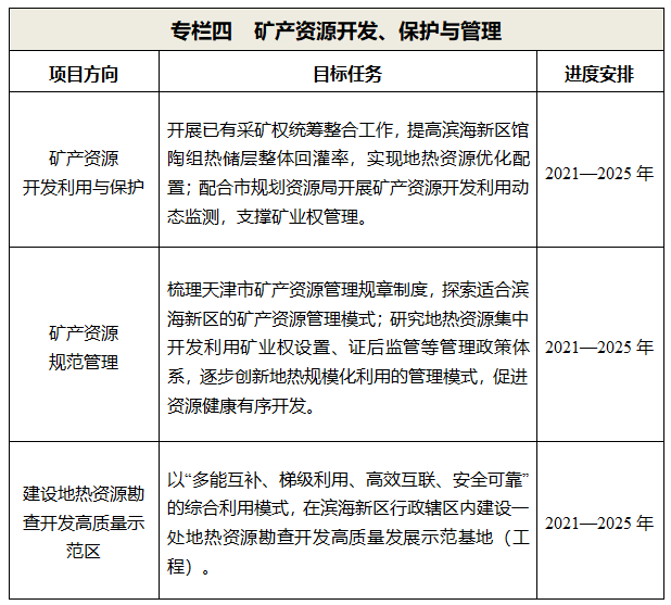基于滨海新区地热井综合整改工作完成后,相关条件具备前提下,尝试开展城镇乡村统筹的矿产资源勘查评价工作,摸清资源家底,提升资源保障能力(专栏三)。