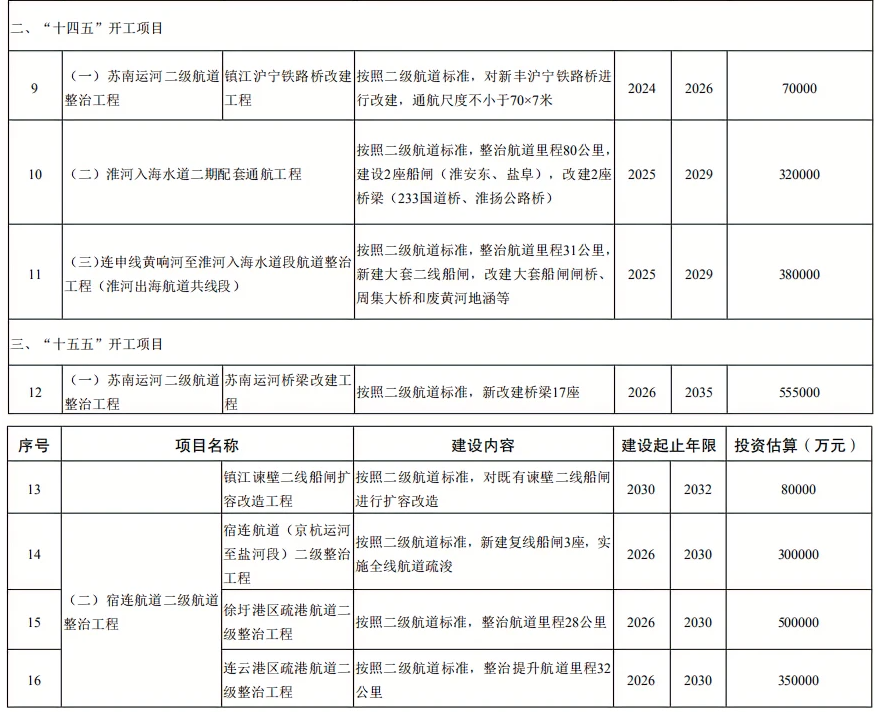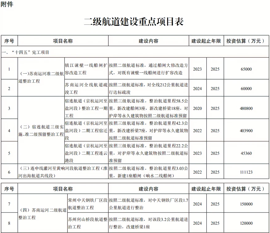 1﹒统筹推进二级航道网规划建设。开展二级航道网规划编制,在现有基础上规划新增苏南运河、宿连航道、连申线(通榆运河、望虞河)等二级航道,规划新增二级航道里程1000公里以上,全省二级航道总里程超过2000公里。到2025年,苏南运河达到准二级,实现2000吨级船舶全天候畅行;宿连航道实现三级航道全线贯通、二级航道预留到位,连云港港国际枢纽海港集疏运能力显著提升。