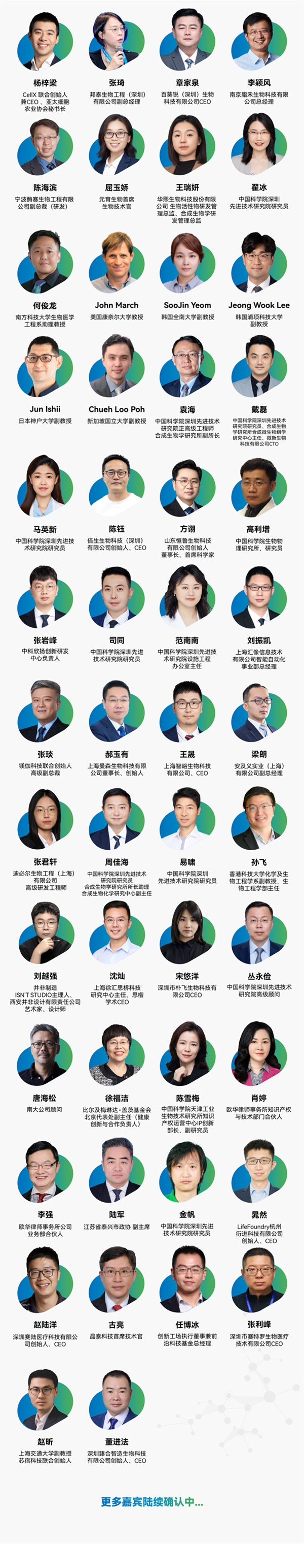 中国工程院院士、中国科学院上海营养与健康研究所研究员杨胜利,中国科学院院士、中国科学院分子植物科学卓越创新中心研究员赵国屏,中国工程院院士、南京工业大学生物与制药工程学院教授应汉杰等知名院士;中国科学院天津工业生物技术研究所所长、研究员马延和,中国科学院深圳先进技术研究院院长、研究员樊建平,深圳理工大学(筹)合成生物学院院长、中国科学院生物物理研究所研究员张先恩,中国科学院创新发展研究中心主任穆荣平等专家学者;北京大北农科技集团股份有限公司总裁、大北农科创基金董事长宋维平,广东省广新控股集团副总经理刘立斌,华熙生物科技股份有限公司董事长兼总经理赵燕等产业大咖;成为资本董事长及管理合伙人李世默,软银中国资本合伙人刘缨,纽尔利资本创始合伙人林向红等投资精英;韩国科学技术院协理副院长Byung-Kwan Cho,NEDO 技术开发机构技术战略研究中心生物技术部门长Mizunashi Wataru(水无 渉),新加坡合成生物学联合会主任、新加坡国立大学合成生物学临床与技术创新中心主任Matthew Chang,康奈尔大学教授John March等国外知名专家学者共聚一堂、献智论道,打造集学术、产业、资本为一体的高规格国际盛会。