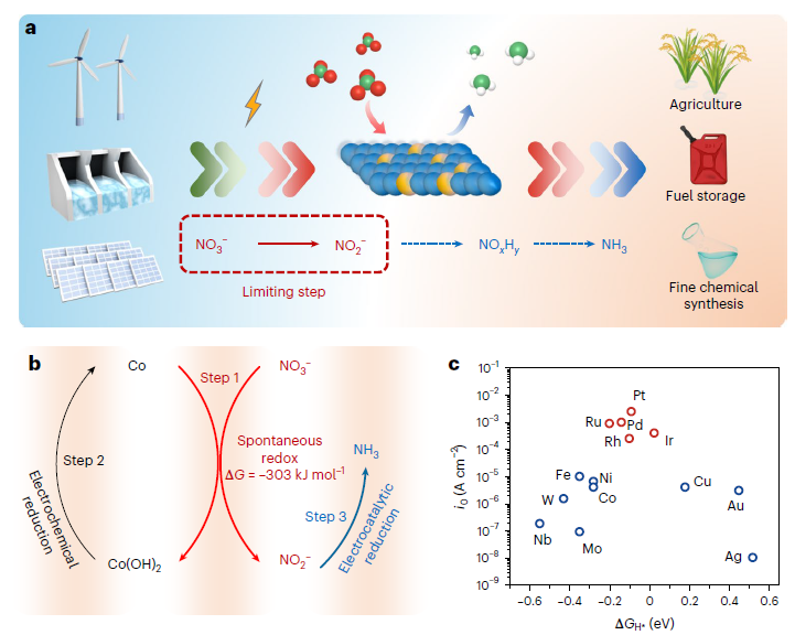 天津大学氨氢新能源团队的分子+研究院于一夫教授和理学院张兵教授课题组致力于绿氨温和制备研究,在国际上率先提出电催化氮气“氧化-还原”接力制氨策略,并建立了相对完整的具有自主知识产权的新型合成氨催化剂的专利体系,在氮气氧化和含氮氧化物还原领域取得了一系列成果。最近,提出三步接力机制实现高效电催化合成氨,起始电位接近理论电位,合成氨成本低于市场价格,且在长程稳定性和再生循环测试中均保持稳定。该论文第一作者、分子+研究院研究助理汉术和博士介绍,这项发现是化学、化工、材料等学科交叉的结果,可能为相关领域催化剂设计提供新思路。