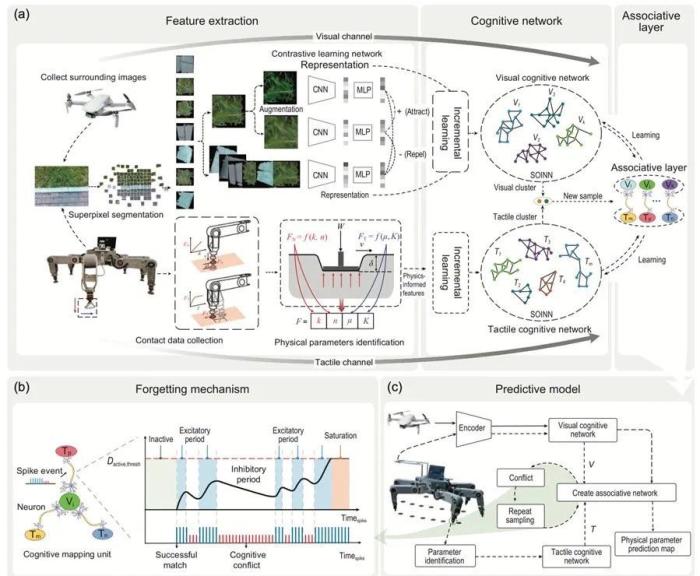 研究人员以法向或切向足地作用力学模型为基础,设计了基于模型——数据的无监督学习框架。该研究首次提出具有认知冲突解决能力的增量式在线学习方法,使机器人能够通过视觉与触觉融合感知自主识别环境物理特征信息。