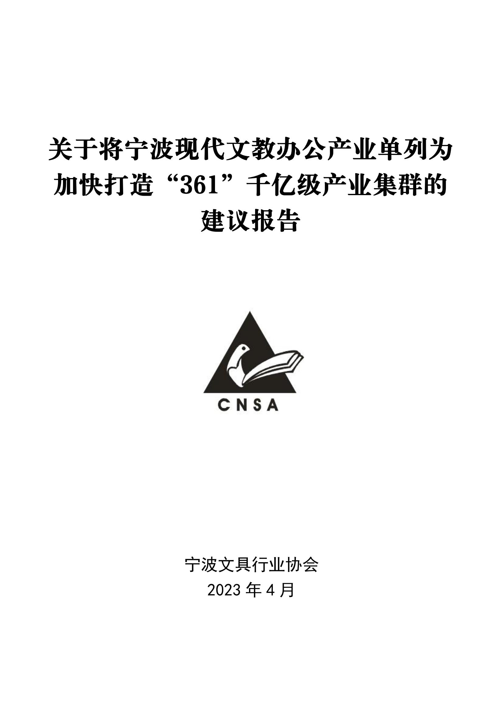 会上,俞勇锋汇报指出,宁波文具产业基础扎实、技术力量雄厚、区位优势突出、建设平台齐全,既有全国文具产业链主企业、又是全国轻工业30个先进产业集群之一,吁请主管部门将宁波文具产业定位为宁波现代文教办公产业集群,单列为宁波市加快打造“361”万千亿级产业集群行动的第七大千亿级产业集群,加快开发绿色、智能、健康、多功能和电子化的中高端文教办公用品,满足国内外持续升级的数字化、智能化、远程化和个性化文教办公用品消费需求。