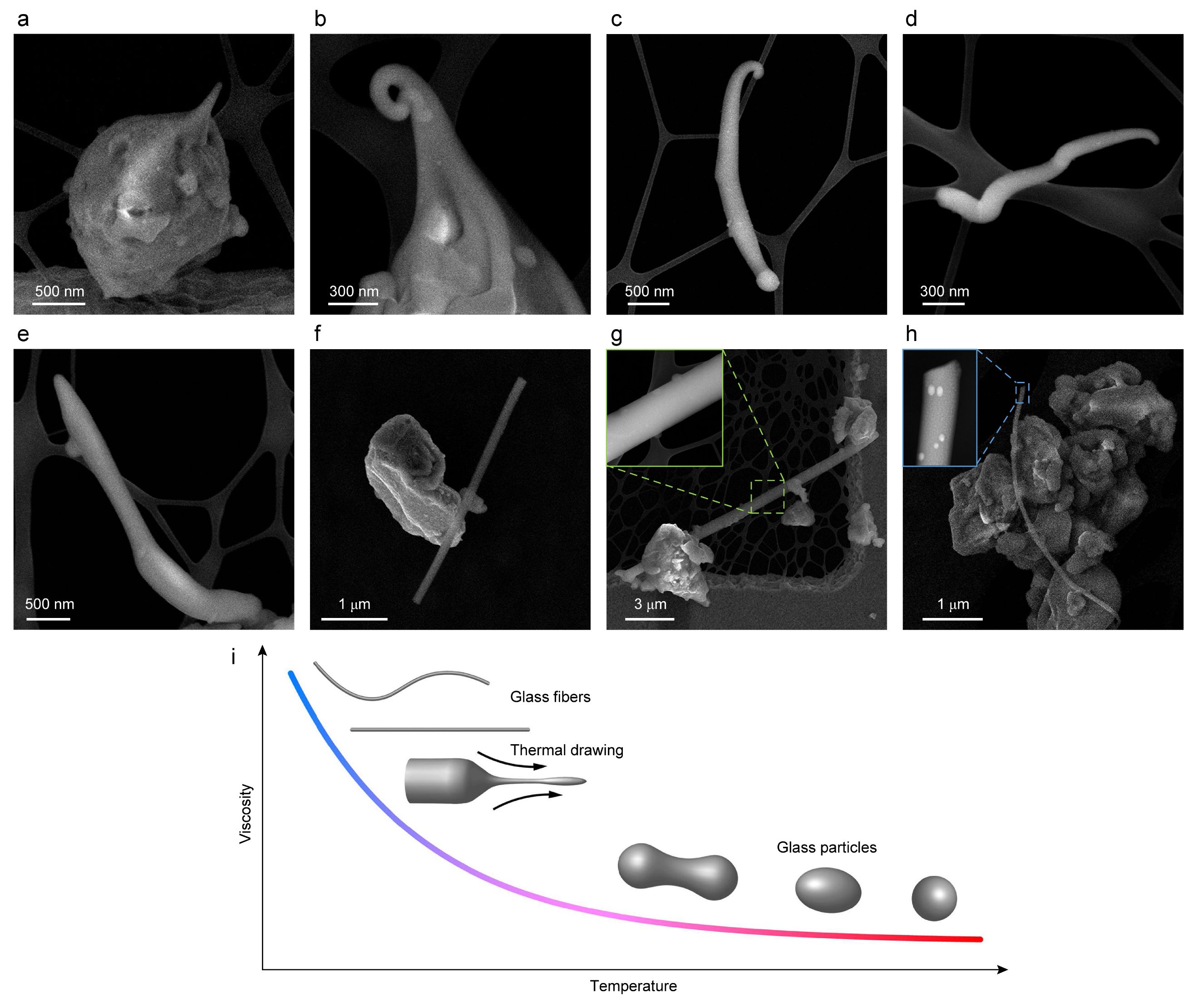 尤其值得关注的是,研究人员在嫦娥五号月壤中首次发现了天然玻璃纤维。这些具有超高长径比的玻璃纤维来源于撞击过程中黏稠液体的热塑成型。和低长径比的玻璃珠相比,形成这些玻璃纤维的液体黏度要更高,意味着对应的撞击温度和撞击速率更低。这反映了月球表面较为温和的微撞击事件。