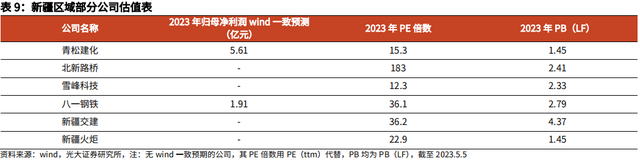 建议关注:青松建化(新疆生产建设兵团旗下企业,主营水泥、PVC等业务,1.45倍PB估值),北新路桥(兵团旗下企业,主营路桥工程等,2.41倍PB),雪峰科技(新疆国资委旗下企业,主营民爆、化工等业务,2.33倍PB),八一钢铁(宝武集团旗下钢厂,2.79倍PB),新疆交建(新疆国资委旗下企业,主营路桥工程等,4.37倍PB)。随着区域经济活跃度提升,物流、商贸、养殖等本土产业亦将有较好发展空间及潜力。注:以上PB估值为PB(LF)。