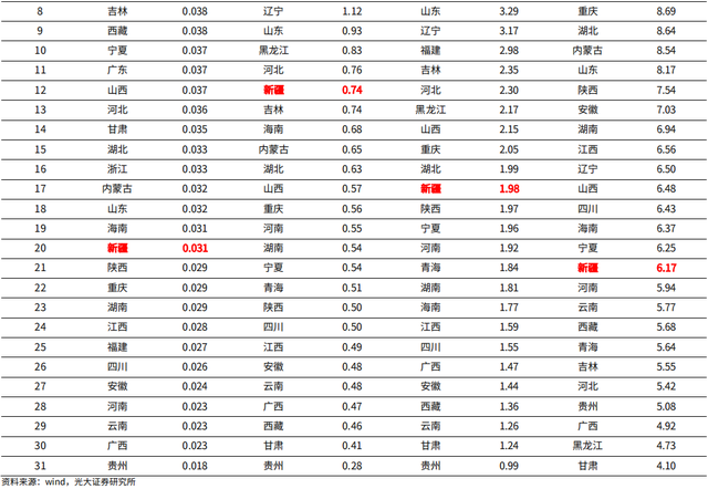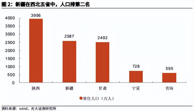 深蹲:边疆经济发展受运距制约,海运出口型贸易体系下具有天然劣势。新疆占我国国土面积的六分之一,常住人口为2500余万人,在西北诸省中仅次于陕西,与甘肃人口规模相当。新疆地区资源禀赋较优,坐拥各类金属及非金属矿产资源,以及石油、天然气、煤炭、日照及风场等丰富的能源资源,农林牧宜用土地资源占全国的10%以上。