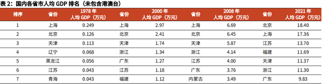 新疆拥有丰富的资源禀赋,但过去由于多重因素的制约,新疆地区整体发展水平慢于全国。1978年,改革开放初期,新疆人均GDP约为0.03万元,在大陆各省市中排在第20位;2000年,我国加入世贸组织前夕,新疆人均GDP排名上升至第12名。此后,新疆在国内排行榜(此处仅统计了大陆地区各省市,未包含港澳台,下同)中总体回落,2008年“四万亿”初期,排第17名;2021年,排全国第21名。