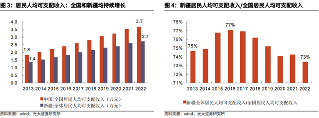 从人均可支配收入角度来看,2017-2022年,新疆全体居民人均可支配收入占全国居民人均可支配收入比重总体呈下降趋势;2022年该比例约为73%,低于2013年同期。