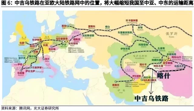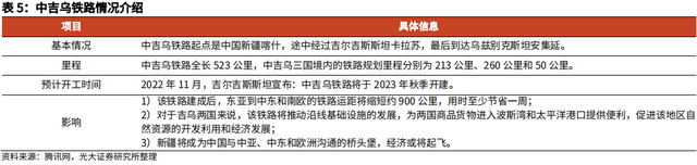 中吉乌铁路处于项目推进的关键时期。该铁路设想最早于1997年提出,期间历经波折,近期有加速推动的趋势;2022年,中、吉、乌三方签署《关于中吉乌铁路建设项目(吉境内段)合作的谅解备忘录》。该铁路通车后,将成为我国到中东、欧洲地区的最短铁路货运线路,货运路程缩短900公里、时间节省7-8天。铁路开通后,我国与中亚乃至中东、欧洲的货运成本将大幅降低。
