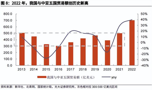 自“一带一路”倡议提出以来,2013-2021年我国与中亚五国贸易额基本保持在300-500亿美元区间内;2022年,中国与中亚五国贸易额达702亿美元,创历史新高,同比+40%。